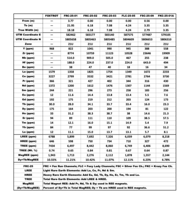 Fox Run Prospect: It is located approximately 2.5 km east of the Foxtrot Deposit and occurs in the same CREE-enriched felsic peralkaline unit as this deposit (see Figure 1). The 2025 program consisted of 7 hand-dug channels measuring a total of 128m.